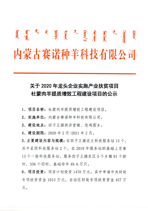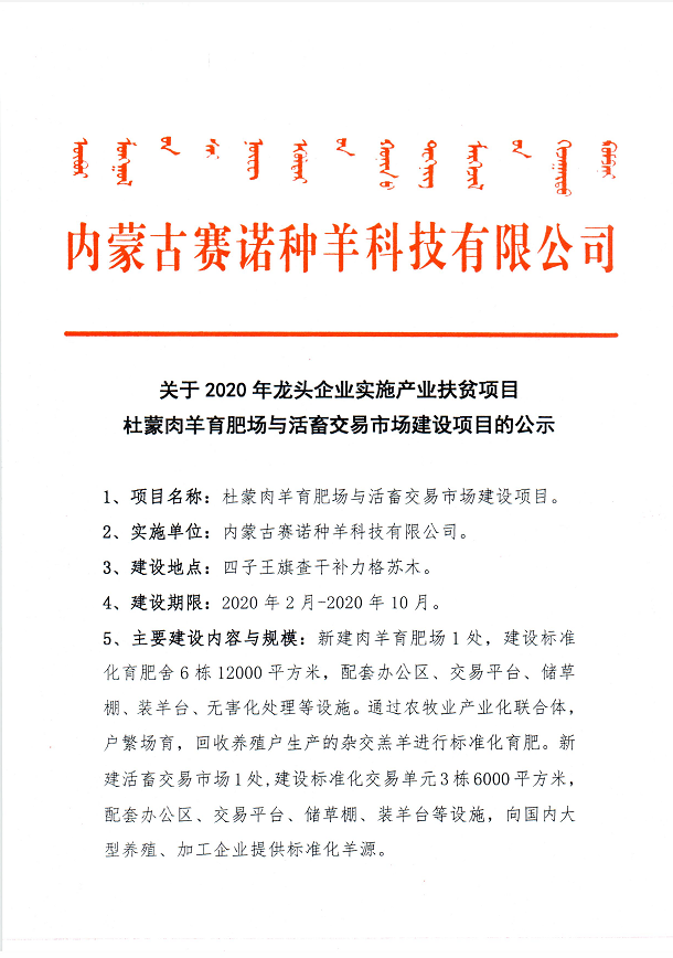 關(guān)于內(nèi)蒙古賽諾種羊科技有限公司承擔(dān)實施2020年龍頭企業(yè)實施產(chǎn)業(yè)扶貧項目的公示