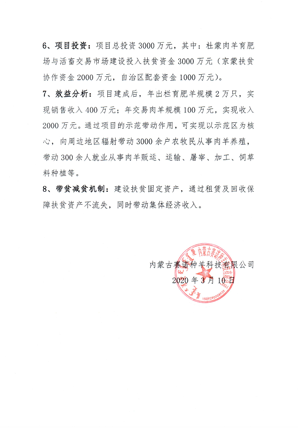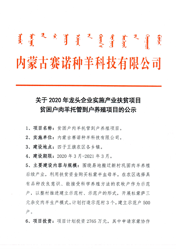 根據(jù)四子王旗扶貧開發(fā)辦公室《關(guān)于2020年龍頭企業(yè)實施產(chǎn)業(yè)扶貧項目及資金安排的意見》等文件,2020年四子王旗產(chǎn)業(yè)扶貧項目共實施5個項目,其中由內(nèi)蒙古賽諾種羊科技有限公司負責(zé)實施3個項目,具體項目內(nèi)容及投資公示如下: