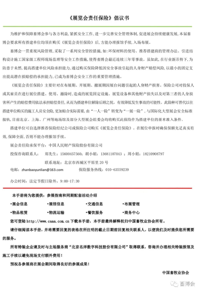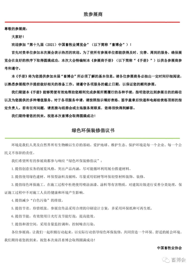 歡迎參加“第十九屆(2021)中國畜牧業(yè)博覽會”(以下簡稱“畜博會”)!首先對貴單位參加本次展會表示熱烈的歡迎。為了使所有參展單位都能獲得及時、完善、周到的服務(wù),確保展覽會在良好的秩序下取得圓滿成功,本次大會特編制本《參展商手冊》(以下簡稱“《手冊》”)以供各參展商參考和遵守。本《手冊》將為您提供參加本屆“畜博會”所必須了解的基本信息。請各位參展商務(wù)必抽出一定時間仔細閱讀,以熟悉參展程序并提前做好相關(guān)的準備工作。請遵守各項服務(wù)的截止日期,以保證您的順利參展。《參展商手冊》詳細內(nèi)容請點這里或“閱讀原文”查看。