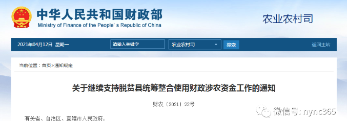 為貫徹落實《中共中央 國務(wù)院關(guān)于實現(xiàn)鞏固拓展脫貧攻堅成果同鄉(xiāng)村振興有效銜接的意見》精神,經(jīng)國務(wù)院同意,現(xiàn)就脫貧縣(指原832個連片特困地區(qū)縣和國家扶貧開發(fā)工作重點(diǎn)縣)延續(xù)執(zhí)行《國務(wù)院辦公廳關(guān)于支持貧困縣開展統(tǒng)籌整合使用財政涉農(nóng)資金試點(diǎn)的意見》(國辦發(fā)〔2016〕22號)有關(guān)事項通知如下:2021-2023年,在脫貧縣延續(xù)整合試點(diǎn)政策。2024-2025年,整合試點(diǎn)政策實施范圍調(diào)整至中央確定的國家鄉(xiāng)村振興重點(diǎn)幫扶縣,確保平穩(wěn)過渡。各省(區(qū)、市)自行確定的其他試點(diǎn)縣,可利用地方各級財政資金繼續(xù)自主開展探索。納入整合試點(diǎn)范圍的資金(以下統(tǒng)稱整合資金)包括各級財政安排用于農(nóng)業(yè)生產(chǎn)發(fā)展和農(nóng)村基礎(chǔ)設(shè)施建設(shè)等方面的資金,原則上與國辦發(fā)〔2016〕22號文件規(guī)定的范圍保持一致(具體資金名稱及支出方向以2020年為準(zhǔn),見附件)。地方各級財政部門要結(jié)合本地實際,明確本級整合資金范圍。教育、醫(yī)療、衛(wèi)生等社會事業(yè)方面資金,也要結(jié)合鞏固拓展脫貧攻堅成果和鄉(xiāng)村振興任務(wù),突出重點(diǎn),集中投入,形成合力。脫貧縣根據(jù)鞏固拓展脫貧攻堅成果和鄉(xiāng)村振興的需要,可以按規(guī)定將整合資金用于農(nóng)業(yè)生產(chǎn)、畜牧生產(chǎn)、水利發(fā)展、林業(yè)改革發(fā)展、農(nóng)田建設(shè)、農(nóng)村綜合改革、林業(yè)草原生態(tài)保護(hù)恢復(fù)、農(nóng)村環(huán)境整治、農(nóng)村道路建設(shè)、農(nóng)村危房改造、農(nóng)業(yè)資源及生態(tài)保護(hù)、鄉(xiāng)村旅游等農(nóng)業(yè)生產(chǎn)發(fā)展和農(nóng)村基礎(chǔ)設(shè)施項目,在整合資金范圍內(nèi)打通,統(tǒng)籌安排使用。脫貧縣要將支持產(chǎn)業(yè)發(fā)展擺在優(yōu)先位置,發(fā)展壯大脫貧地區(qū)優(yōu)勢特色產(chǎn)業(yè)(含必要的產(chǎn)業(yè)配套基礎(chǔ)設(shè)施),促進(jìn)產(chǎn)業(yè)提質(zhì)增效,帶動脫貧人口就業(yè)增收。脫貧縣要將整合資金優(yōu)先用于產(chǎn)業(yè)項目。中央和省、市級財政要在保持投入總體穩(wěn)定的基礎(chǔ)上,繼續(xù)按政策要求向符合條件的脫貧縣傾斜。原則上納入整合試點(diǎn)范圍各項中央財政涉農(nóng)資金用于832個脫貧縣的資金總體增幅不低于每項資金的平均增幅,或確保當(dāng)年安排脫貧縣的資金縣均投入規(guī)模不低于其他縣的縣均投入規(guī)模。中央預(yù)算內(nèi)投資在充分考慮規(guī)劃任務(wù)、地方需求等情況的基礎(chǔ)上統(tǒng)籌加大對脫貧縣支持力度。整合資金原則上仍按原渠道下達(dá)到縣。其中,納入直達(dá)資金范圍的資金,按照直達(dá)資金管理的有關(guān)要求下達(dá)。地方各級財政部門要會同相關(guān)部門,利用現(xiàn)有信息系統(tǒng),建立整合資金臺賬和做好統(tǒng)計分析工作,掌握資金下達(dá)進(jìn)度、支出進(jìn)度和用途、績效等情況,定期匯總報告。脫貧縣根據(jù)“三農(nóng)”工作方針政策、本地鞏固拓展脫貧攻堅成果同鄉(xiāng)村振興有效銜接規(guī)劃和相關(guān)行業(yè)規(guī)劃等,編制年度整合資金實施方案,確定好重點(diǎn)項目和建設(shè)任務(wù),兼顧脫貧村和其他村、脫貧戶和其他戶,因地制宜統(tǒng)籌安排和管好用好整合資金。有關(guān)部門和地方不得干擾脫貧縣按規(guī)定使用整合資金。脫貧縣要健全完善鞏固拓展脫貧攻堅成果和鄉(xiāng)村振興項目庫,整合資金支持的項目原則上從項目庫中選擇,做好項目儲備,科學(xué)設(shè)定績效目標(biāo),嚴(yán)格項目論證入庫。鼓勵整合資金優(yōu)先安排用于既有利于鞏固拓展脫貧攻堅成果、又有利于完成行業(yè)發(fā)展任務(wù)的項目,凝聚支持合力。落實項目資金公開公示和績效管理要求,主動接受各方監(jiān)督。嚴(yán)肅財經(jīng)紀(jì)律,切實防范和化解風(fēng)險隱患,整合資金不得用于償還債務(wù)、墊資或回購、注資企業(yè)、設(shè)立基金、購買各類保險等。堅持“中央統(tǒng)籌、省負(fù)總責(zé)、市縣鄉(xiāng)抓落實”的工作機(jī)制。中央部門統(tǒng)籌指導(dǎo)并加強(qiáng)考核。省級對整合試點(diǎn)負(fù)總責(zé),根據(jù)本通知要求制定整合試點(diǎn)實施細(xì)則,強(qiáng)化對脫貧縣整合試點(diǎn)工作的全過程監(jiān)督指導(dǎo)。進(jìn)一步推動審批權(quán)限下放到脫貧縣,縣級承擔(dān)資金安全、規(guī)范、有效使用的主體責(zé)任,切實加強(qiáng)整合資金使用和項目管理。有關(guān)部門將對政策實施效果進(jìn)行系統(tǒng)總結(jié)和科學(xué)評估。