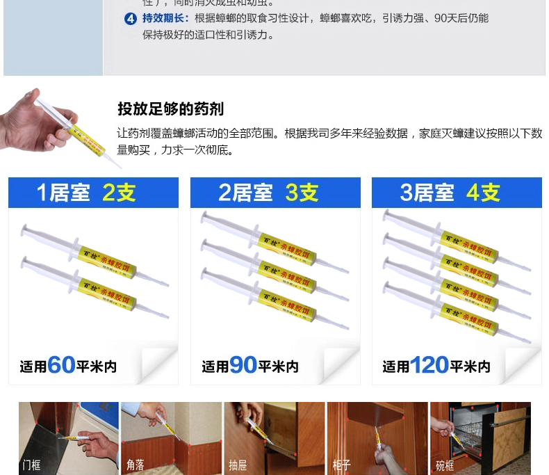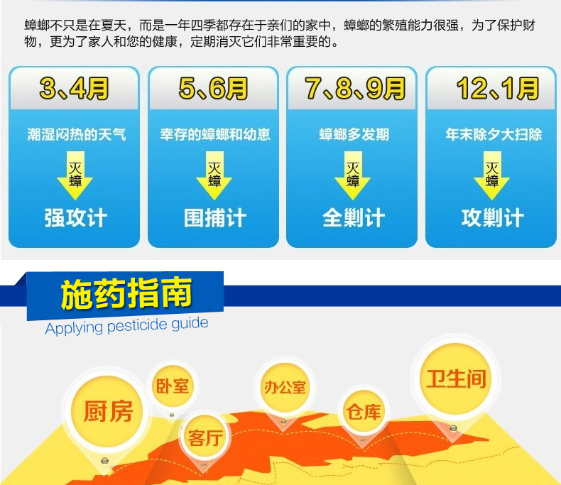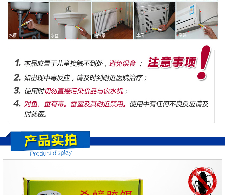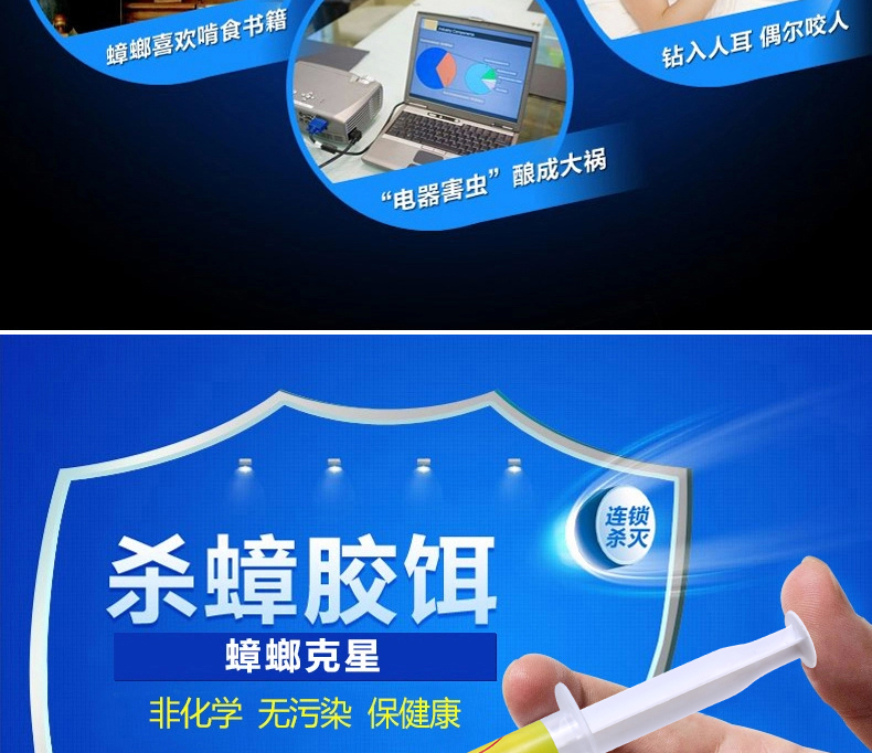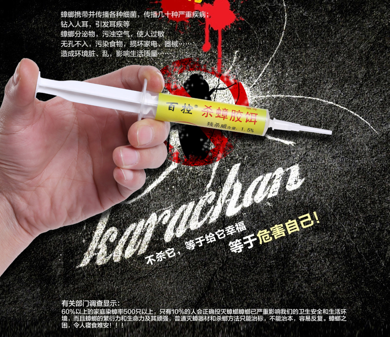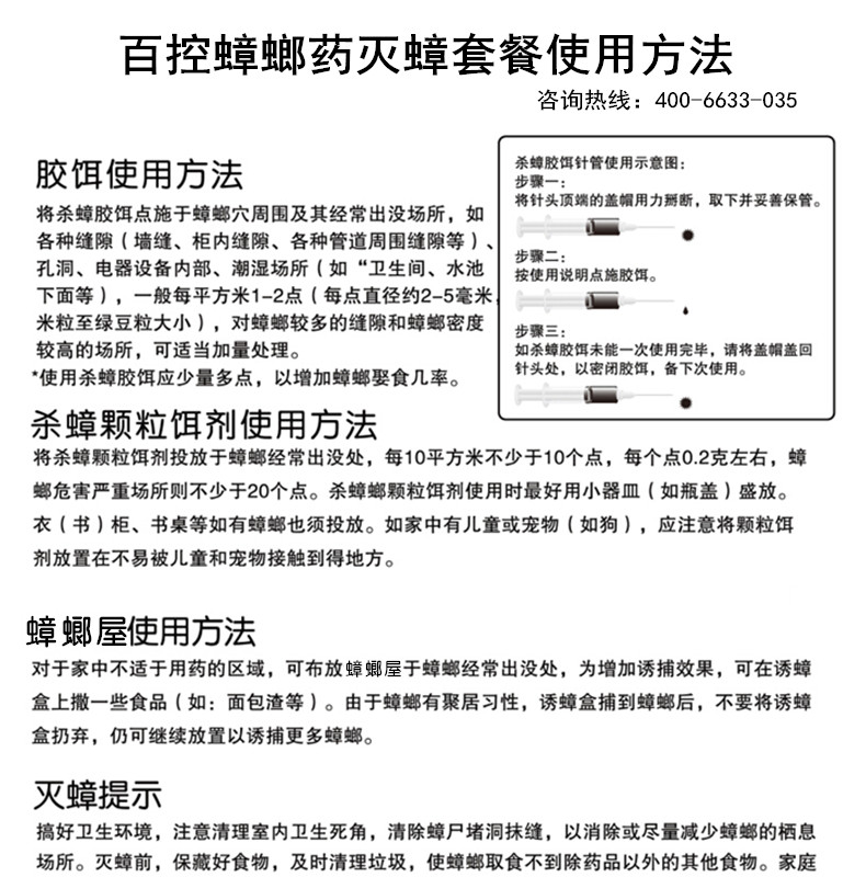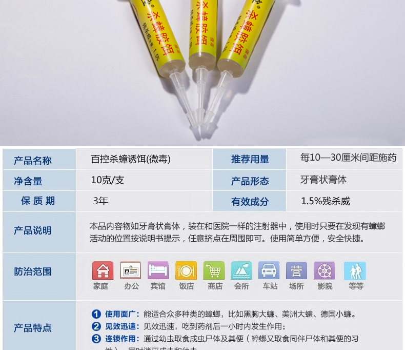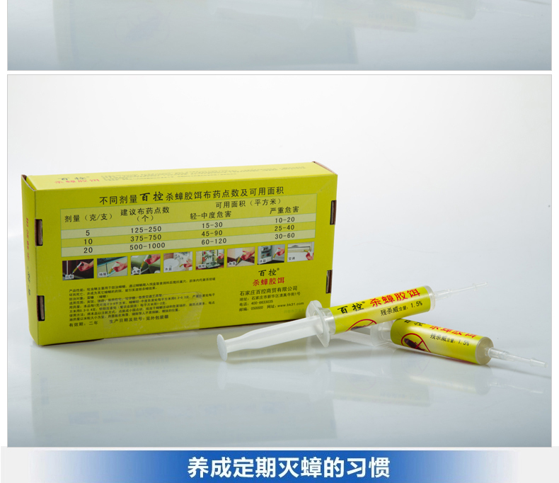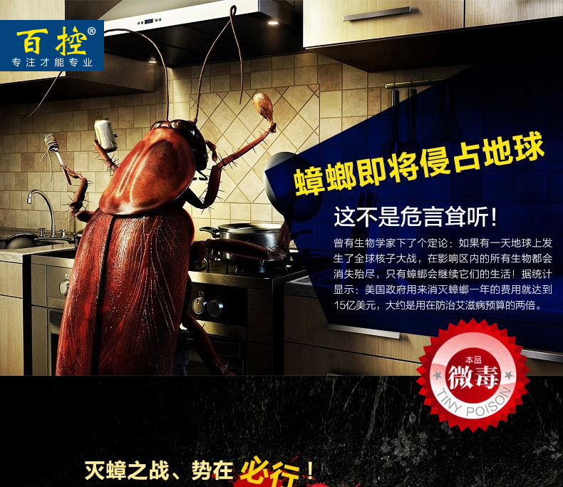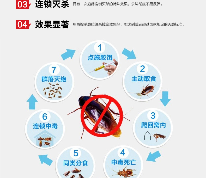 產(chǎn)品特點:·有效成分選用全新一代氟蟲腈,產(chǎn)品配方先進,原藥經(jīng)特殊包裹處理,藥效持久,一次施藥,有效控制蟑螂3-6個月;·適口性好,見效快,且具有連鎖殺蟑效果;·安全、環(huán)保、衛(wèi)生、無腐蝕性;·適用家居、賓館、飯店、超市、倉庫