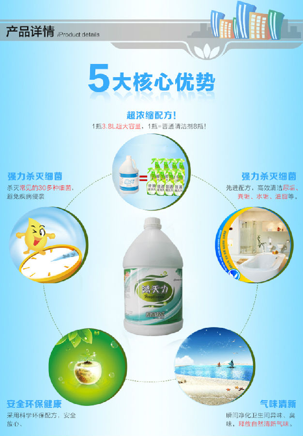 清潔、消毒、殺菌三合一全能消毒劑于酒店、超市、學(xué)校、醫(yī)院、等公共場所的衛(wèi)生保潔、用于地毯發(fā)霉時(shí)、加到清洗地毯水中。